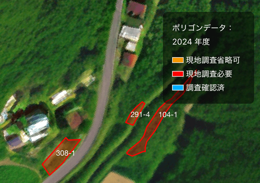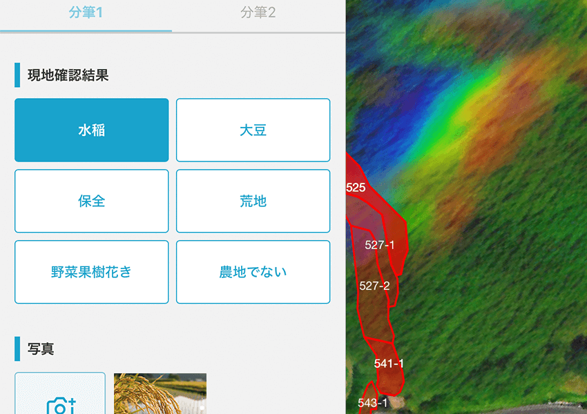 | 現地確認の記録 | 現地調査の結果や撮影した写真を、農地ポリゴンごとに記録可能。 |