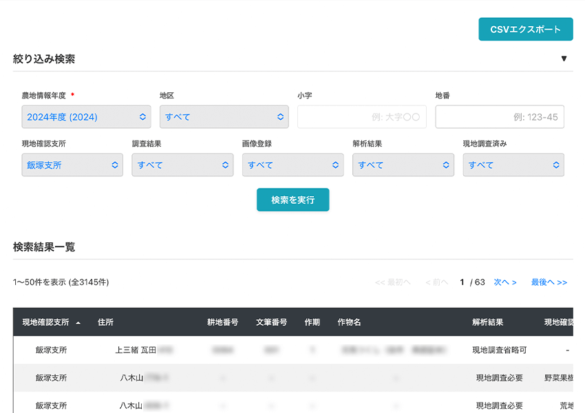 | 農地の検索 | 地名地番、作物名、衛星データの解析結果などで農地を検索可能。 |